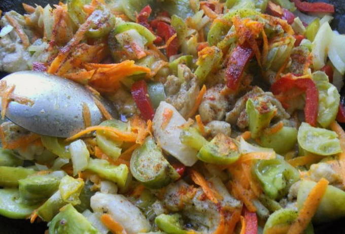 Voeg vervolgens paprika en groene tomaten toe.