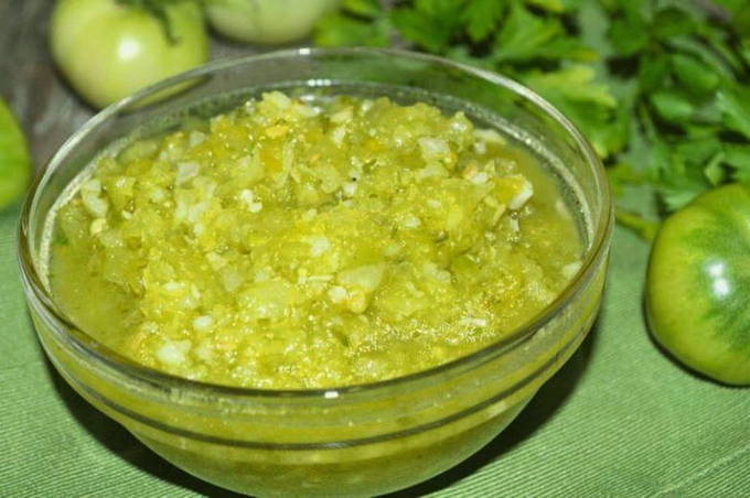 Met knoflook kan een smaakvolle groene tomatensalade worden bereid. Het koude voorgerechtrecept is geschikt voor langdurige opslag in potten. Serveer salade op tafel, op elk moment van het jaar!