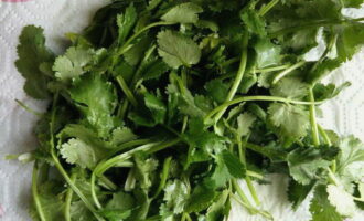 - Was de koriander en leg hem op een handdoek om overtollig vocht te verwijderen. Hak vervolgens de greens fijn met een mes. Als alternatief kunt u peterselie gebruiken in plaats van koriander.