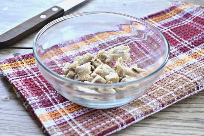 - Verwijder het vel van de kip en haal de botten eruit. Snijd de voorbereide filet in kleine blokjes over de vezels. Doe de gesnipperde kip in een slakom.