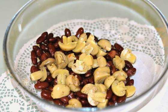 Deze salade zal helpen in situaties waarin er geen tijd is om te koken, maar je wel iets lekkers moet serveren. Een minimum aan tijd en noodzakelijke producten - en een geweldige salade is klaar. Het belangrijkste is om een pot bonen, ingelegde champignons en een pakje crackers op voorraad te hebben. Nou, kaas en mayonaise vind je in elke koelkast. Een heel bescheiden setje voor zo'n heerlijk tussendoortje.