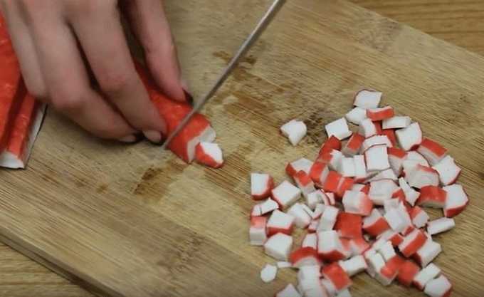 - Snijd de krabsticks in dunne dwarsstukken, giet in een kom.
