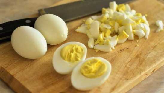 - Hardgekookte eieren, afkoelen en pellen. Snijd ze in kleine blokjes.