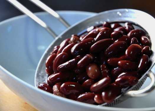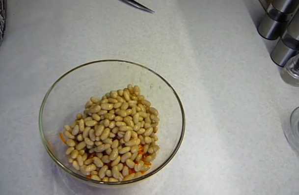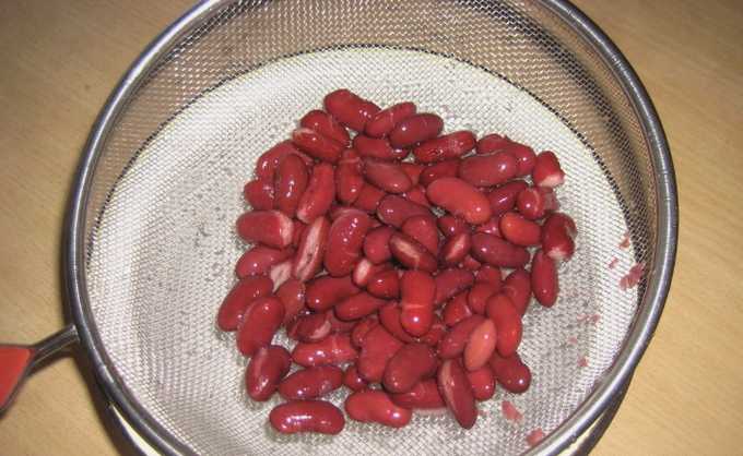 - We openen de pot bonen, doen de korrels op een zeef. Nadat het sap is uitgelekt, giet je de bonen in een slakom.