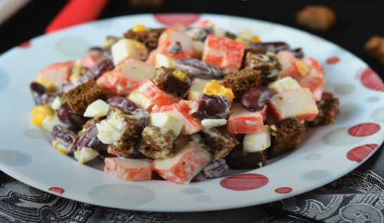Heerlijke en hartige salade met bonen, krabsticks en croutons