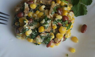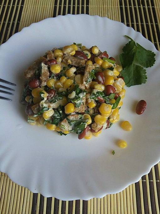 Bonengerechten zijn altijd erg bevredigend. Deze salade is geen uitzondering. Voeg krokante croutons toe als contrast met het malse bonenpulp. Voor smaak - gehakte koriander. Als het in uw gezin niet de voorkeur heeft, kunt u het vervangen door peterselie. Ingeblikte maïskorrels voegen een vleugje zoetheid toe. Het is beter om zo'n salade direct na het koken te serveren, zodat de croutons geen tijd hebben om nat te worden.