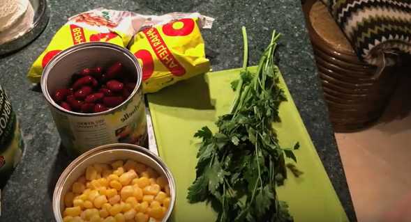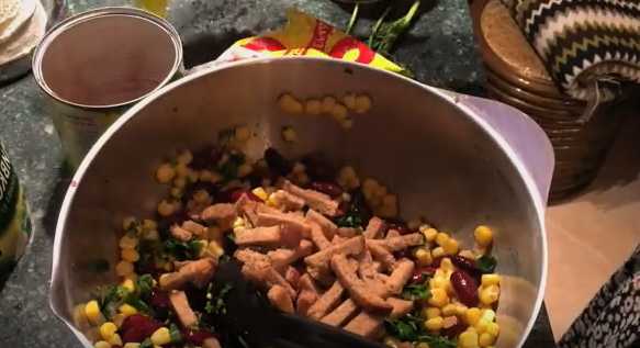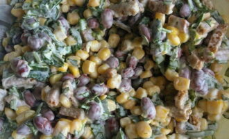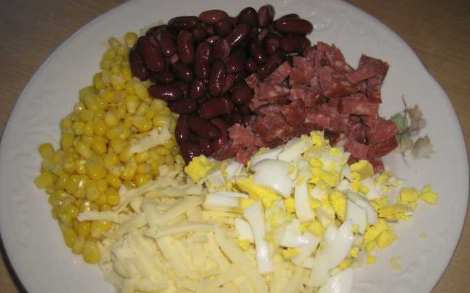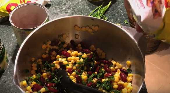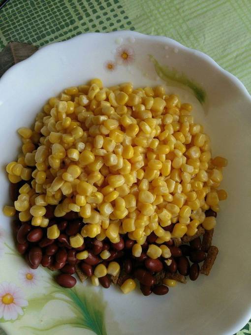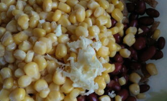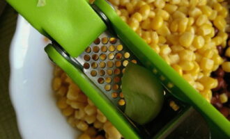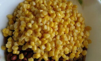 - We openen de potten met bonen en maïs, gooien de granen in een vergiet. Nadat het overtollige vocht is weggelopen, giet je de bonen en maïs in een slakom.