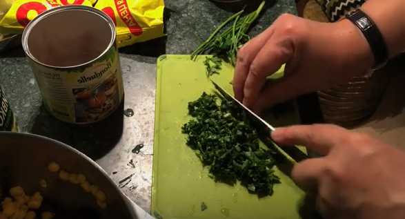 - Was de peterselie grondig en droog hem af op een handdoek. Hak het fijn met een mes en stuur het naar bonen en kaas.