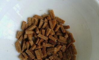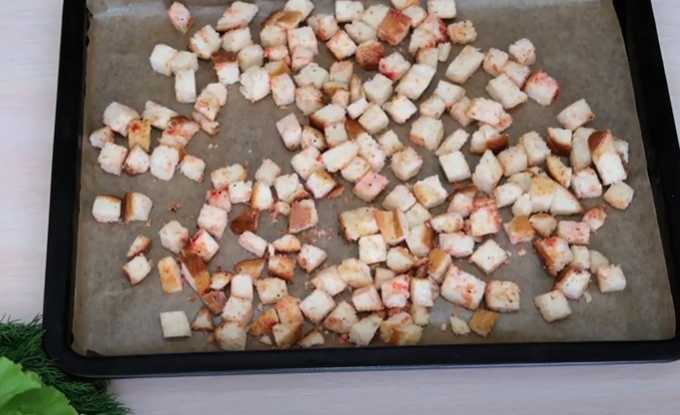 - Meng de blokjes met je handen en giet ze op een met bakpapier beklede bakplaat.We zetten een bakplaat in een op 200 graden voorverwarmde oven en bakken crackers tot ze goudbruin zijn. Voor de gelijkmatigheid kun je de oven een paar keer openen en de blokjes omroeren. Voorlopig duurt het twintig tot vijfentwintig minuten om te bakken tot het begint te blozen. Giet de croutons na het bakken in één laag op een bord en laat ze afkoelen.