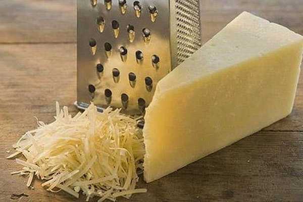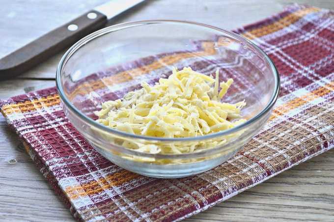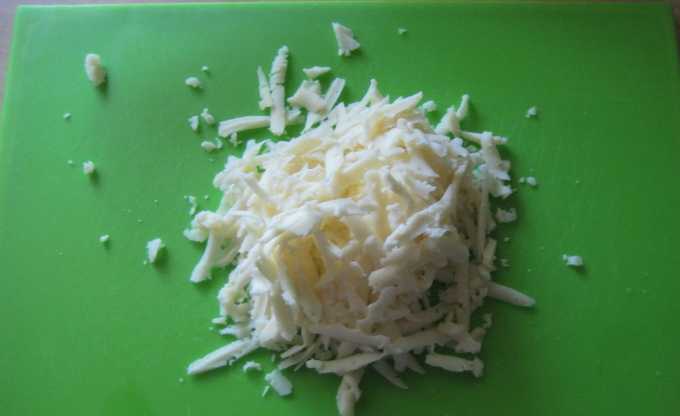 - Wrijf de kaas op een rasp met grote gaten en giet de resulterende schaafsel in een slakom.