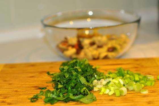 - Was de peterselie en groene uien en droog ze af met een handdoek. Hak fijn met een mes. Giet gehakte greens bij champignons en bonen.