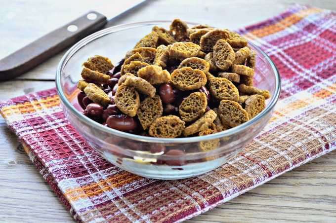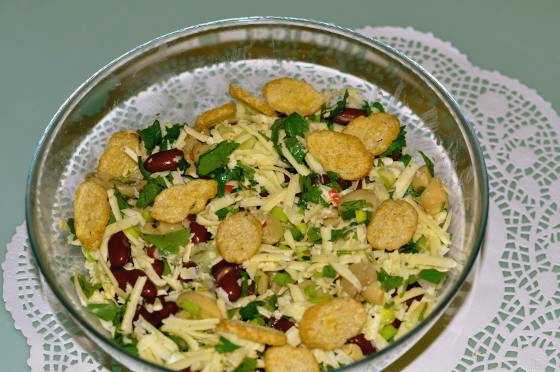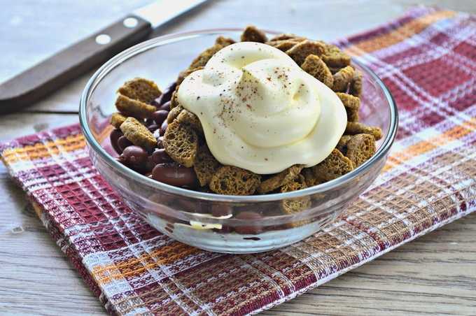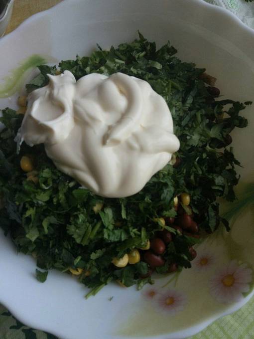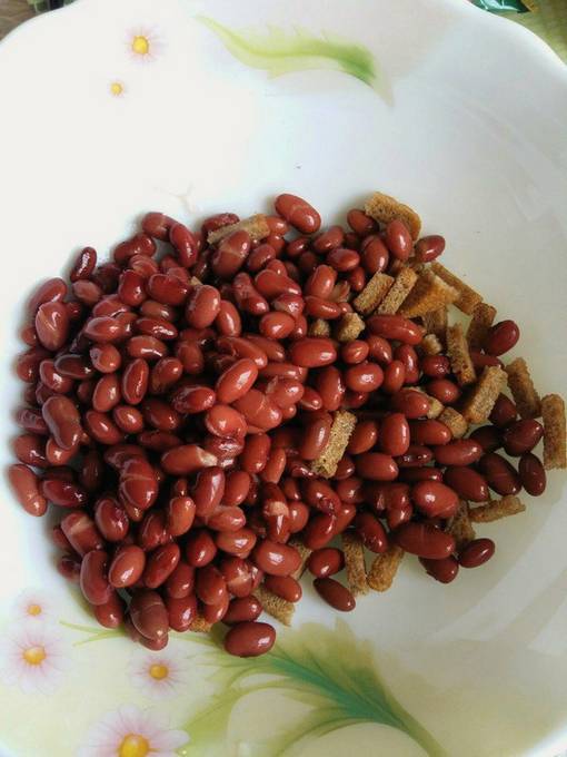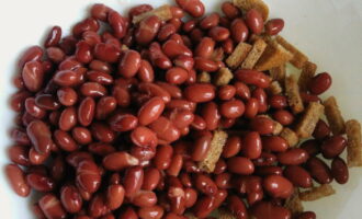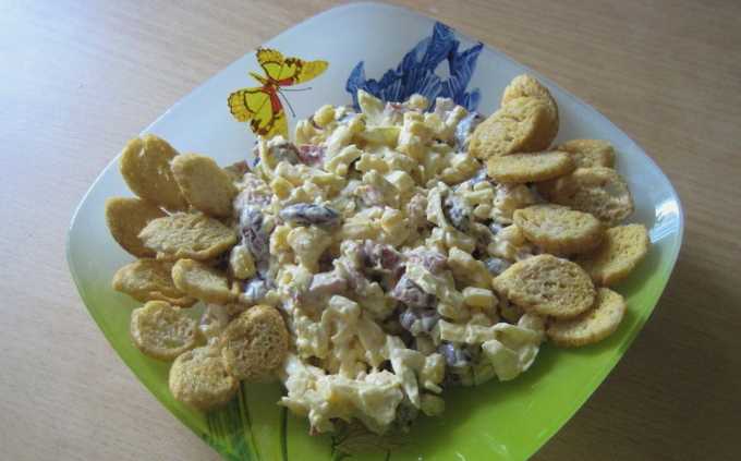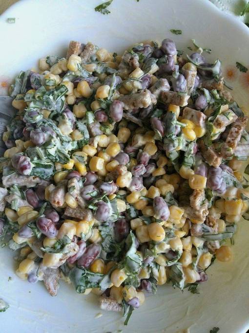 Verrassend genoeg geven de ingrediënten in ieder geval zo'n rijke smaak. Bonen en croutons vormen een zeer succesvolle combinatie, maar ook een zeer bevredigende. Kaas en kruiden veredelen alleen de algehele smaak. Mayonaise is ideaal als dressing.