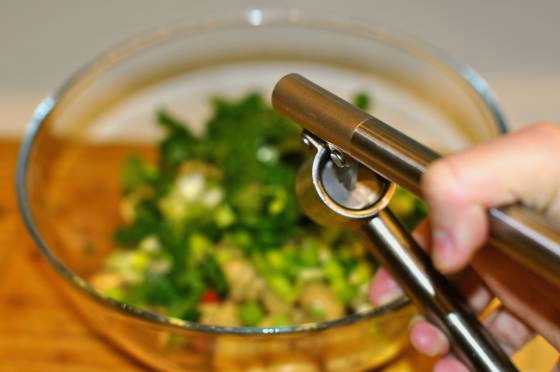 - Pel de knoflook en haal deze door een pers. We sturen de knoflookpap naar de slakom met de rest van de ingrediënten.