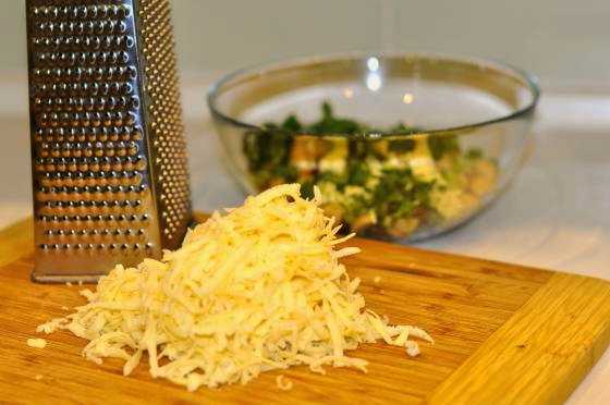 - Wrijf de kaas op een grove rasp en giet deze in een slakom.