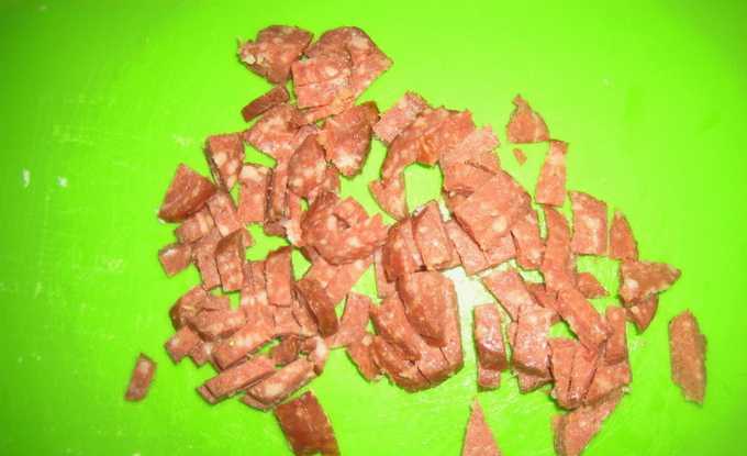 - Haal de rookworst uit de schil en snijd in reepjes. giet in een slakom.