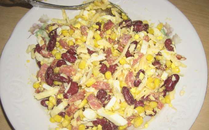 Hartige salade met worst, maïs, bonen en croutons