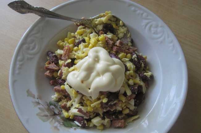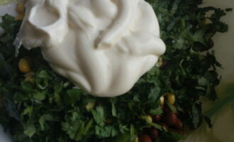 - Voeg mayonaise en zout naar smaak toe. We mengen de ingrediënten allemaal door elkaar - de salade is klaar.