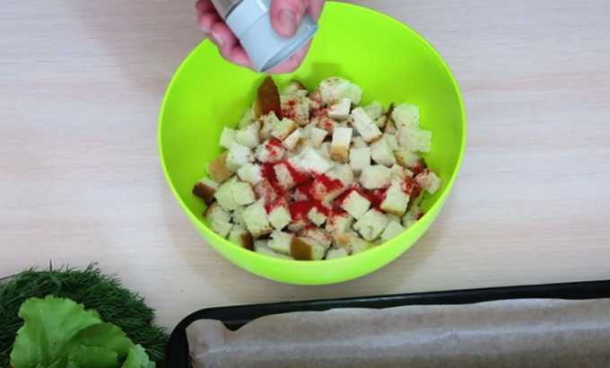 - Om tijd te besparen, beginnen we met het maken van croutons. Snijd de korst van het brood en snijd het kruim in kleine blokjes. We plaatsen ze in een kom. Bestrooi toekomstige crackers met zout, zwarte peper, paprika en royaal bestrooid met boter gesmolten tot een vloeibare toestand. Haal de knoflook door een pers en leg deze op de croutons.