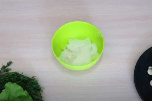 - We wassen de komkommers, drogen ze en snijden de uiteinden aan beide kanten af. Als de vruchten niet jong zijn, is het beter om de schil en grove zaden te verwijderen. Snijd de komkommers in dunne reepjes en stuur ze naar de slakom.