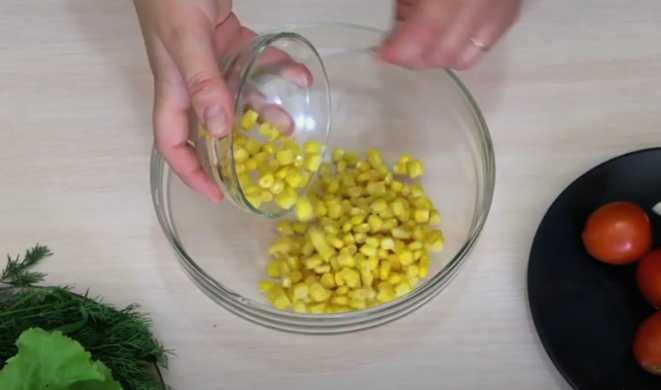 Hetzelfde doen we met maïs. Voeg het toe aan de saladekom.