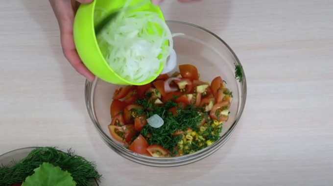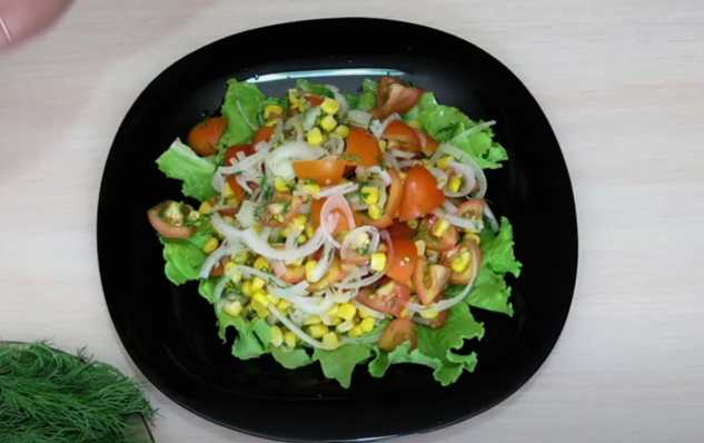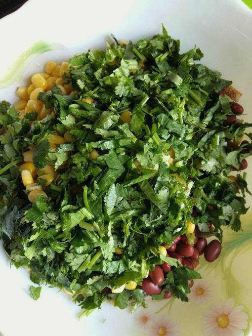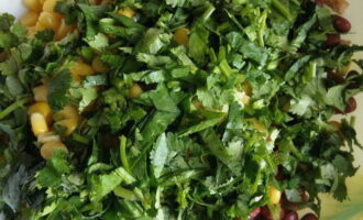 - We wassen de dillegroenten, drogen en hakken. Giet greens en gekoelde uien in een kom met tomaten en maïs. Giet de dressing erbij en meng voorzichtig.