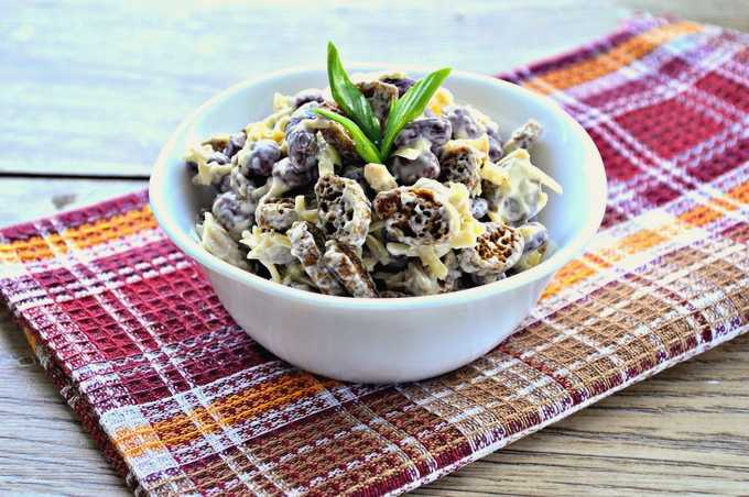 Een uitstekende salade voor liefhebbers van bonensalades. De zachte malse bonen vullen we aan met krabsticks, eieren en krokante roggecroutons. We zetten ook knoflook voor pikantheid. Zo'n salade kan het avondeten vervangen, omdat het behoorlijk bevredigend blijkt te zijn.