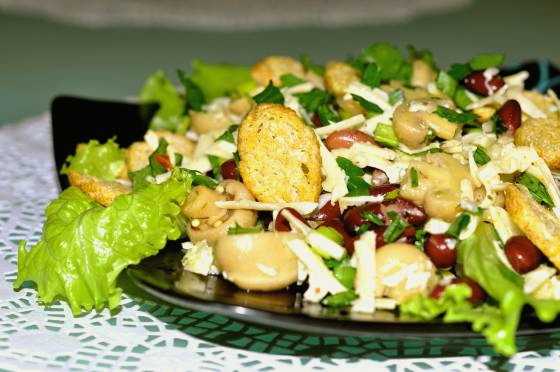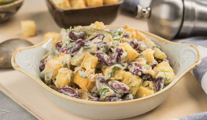 - Pittige salade met bonen, kaas, knoflook en croutons