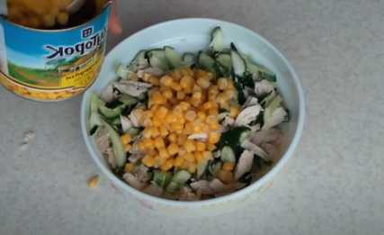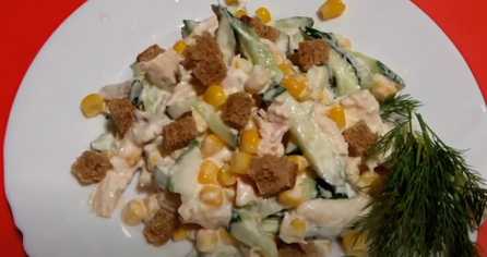 Een zeer lichte salade die de maaltijd niet overbelast en variatie aan het menu toevoegt. De hoofdingrediënten zijn maïs en komkommers. We voegen ook gekookte kipfilet toe voor verzadiging en voedingswaarde. Bestrooi het voorgerecht bij het serveren met roggecroutons - ze benadrukken de malsheid van de salade en voegen een passend broodaccent toe.