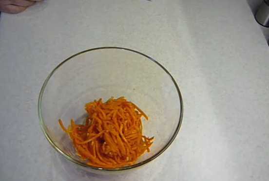 - We persen de Koreaanse wortelen met onze handen uit het overtollige vocht, snijden ze met een mes in kortere stukken en leggen ze in een slakom.