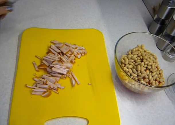 - We openen de pot bonen, gooien de granen weg in een vergiet. Nadat het sap is uitgelekt, giet je de bonen in de slakom na de kaas.