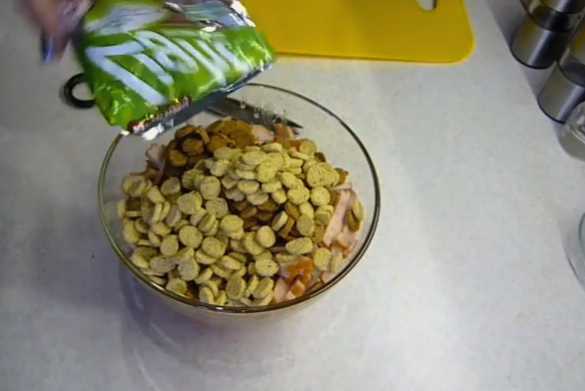 - Schenk na de worst beide soorten crackers in een slakom.