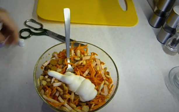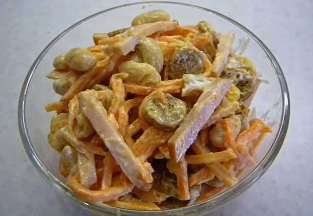 Deze salade heeft een zeer rijke smaak dankzij de Koreaanse wortelen en twee soorten pittige croutons. Bonen fungeren als een neutrale achtergrond en worst is een extra smaakaccent. Het voorgerecht is goed voor bier of als je gewoon "iets lekkers" wilt.