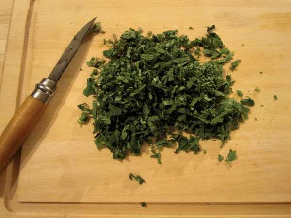 We wassen de koriander, drogen hem en hakken hem fijn met een mes. Neem anders peterselie.