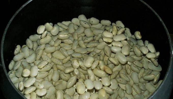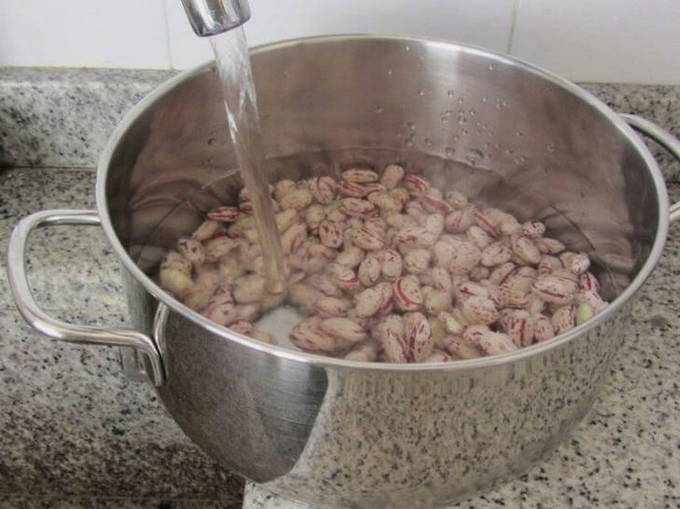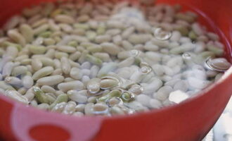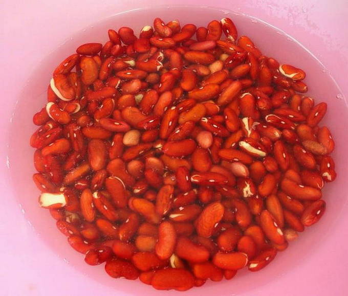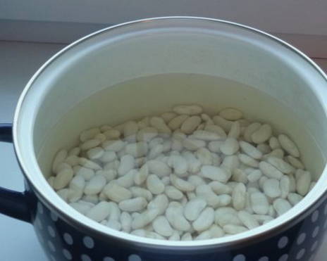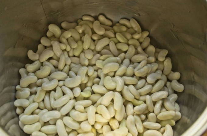 - De bonen moeten een dag voor het begin van het koken worden gesorteerd, vuil en bedorven bonen verwijderen en vervolgens water in een verhouding van 1: 2 gieten en 12 uur laten staan.