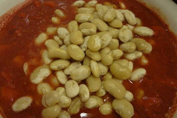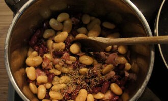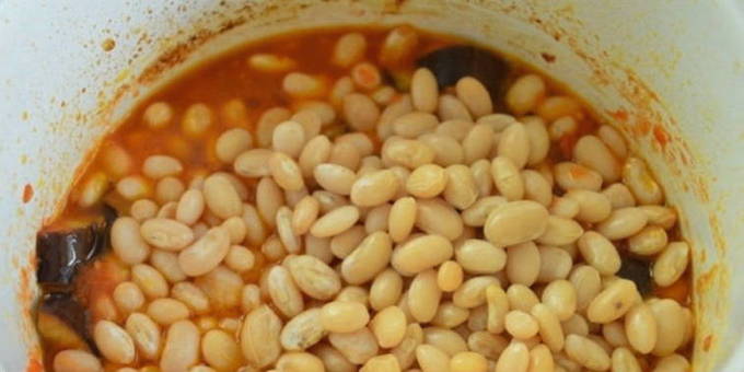 - Doe de bonen in de resulterende saus, breng op smaak, voeg kruiden toe en controleer of de smaak in balans is. Kook de bonen nog 20 minuten in de tomaten.