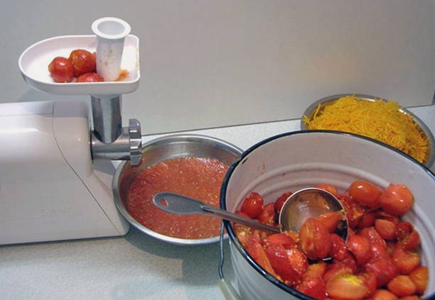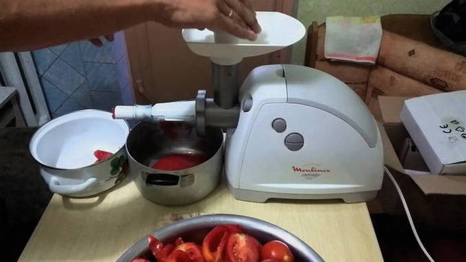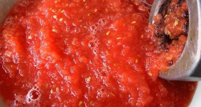 - Draai de tomaten tot puree. Je kunt ze draaien in een vleesmolen of ze malen in een blender.