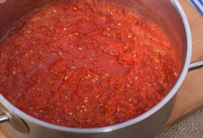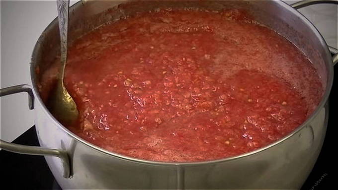 - Breng de tomatenmassa over in een diepe pan, breng op smaak en laat sudderen, al roerend met een houten lepel of spatel, tot het dikker wordt.