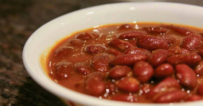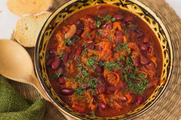 Naast bonen bevat deze bereiding tomaten, uien, paprika's en wortelen. Knoflook voegt pikantheid toe, maar als je maximale scherpte wilt, is het beter om gemalen chili toe te voegen tijdens het koken.