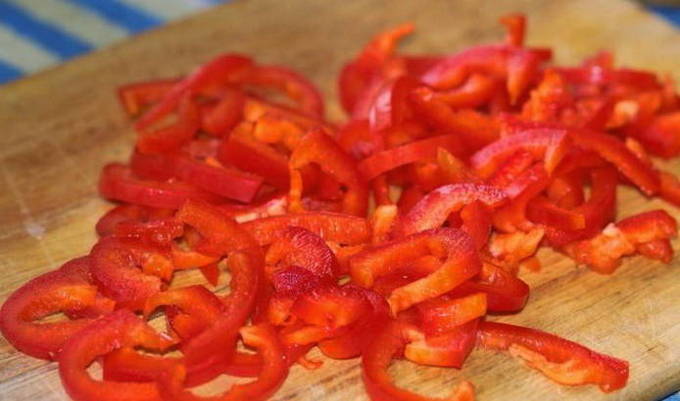 Draai de tomaten in een vleesmolen, hak de paprika's naar eigen smaak - in reepjes of blokjes.