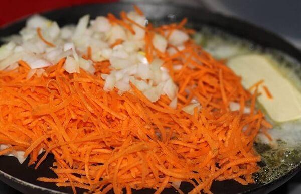- In een grote koekenpan of braadpan in plantaardige olie, fruit de uien ongeveer 5 minuten, voeg dan de wortelen toe en kook nog 5 minuten, voeg dan de paprika toe en laat nog 5 minuten sudderen.