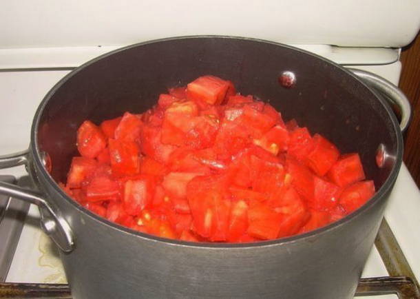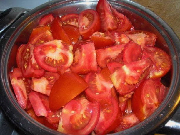 - Schil de tomaten en snijd ze in plakjes, pureer ze en verwarm ze op laag vuur tot ze dikker zijn. Doe groenten in tomatenpuree en laat 20 minuten sudderen.
