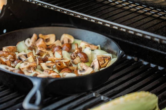 - Voeg gesnipperde uien toe aan de champignons en bak 5-7 minuten, voeg dan de bonen toe.