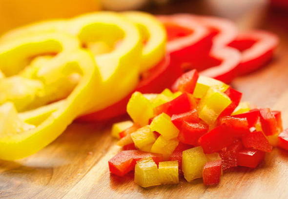 - Schil en snijd de wortelen, uien en paprika's willekeurig - in blokjes of reepjes van ongeveer dezelfde grootte.
