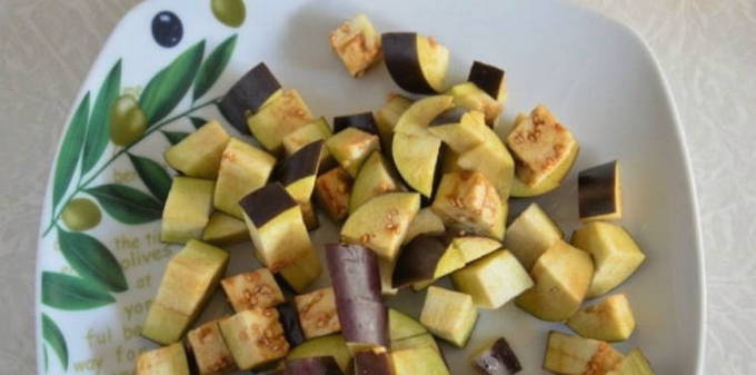 - Bak de stukjes aubergine in een diepe pan of koekenpan, voeg tomatenpuree en bonen toe, laat 20 minuten sudderen en voeg 3 minuten voor het einde van het koken suiker, zout en azijn toe.