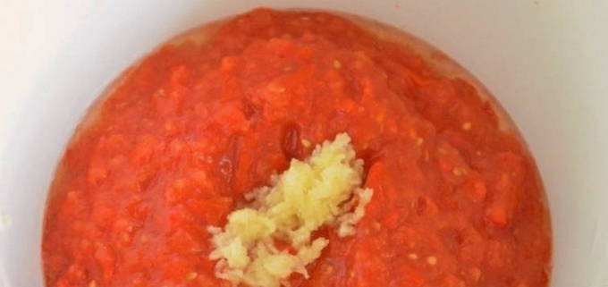 - Verwijder de schil van de tomaten, hak ze willekeurig fijn en pureer ze tot puree. Dit doe je eenvoudig met een blender of vleesmolen.
