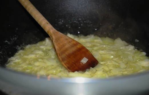 - Schil en ui, snijd in kleine blokjes en bak in olie.
