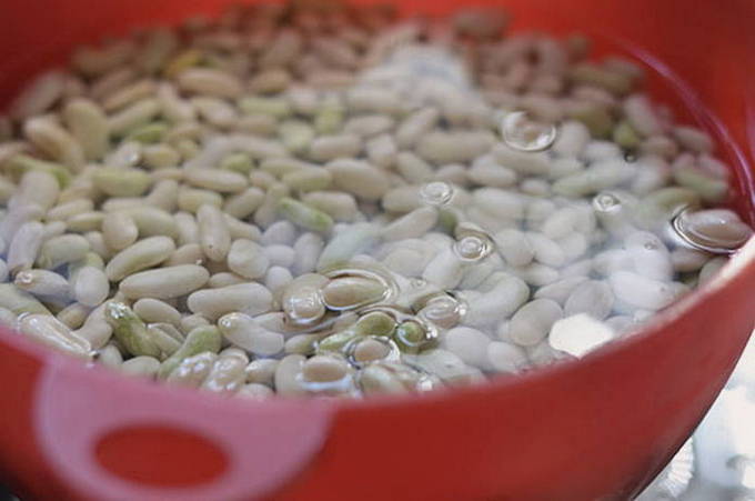 Voor het koken moeten de gedroogde bonen een nacht in koud water worden geweekt en vervolgens worden uitgelekt, vers gegoten en bijna gaar gekookt.