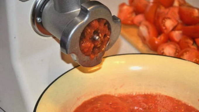 - Draai de tomaten tot puree. Je kunt ze draaien in een vleesmolen of ze malen in een blender.