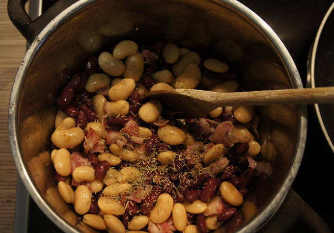 - Rode of witte bonen, enkele uren voorgeweekt, moeten worden gekookt tot ze half gaar zijn.