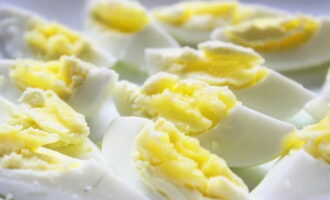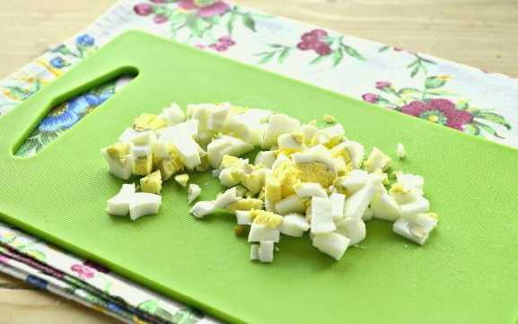 - Snijd de gekookte eieren in kleine stukjes.